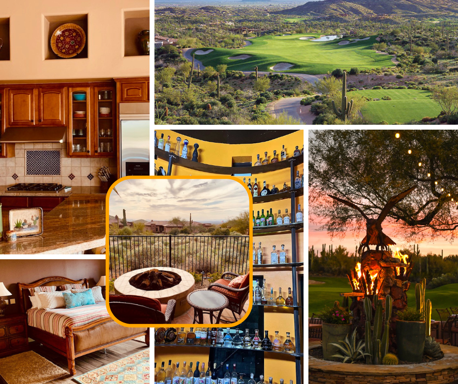 Escape to the desert for a weeklong stay in a stunning 3‑bedroom, 2.5‑bathroom home located within the exclusive Tusayan gated community. This sophisticated home offers the perfect blend of relaxation and refinement and offers sweeping views of Troon Mountain and the twinkling Scottsdale city lights. The open‑concept living space is designed for effortless gathering and comfort, featuring a cozy fireplace, gourmet kitchen, elegant dining area, and spacious great room. Expansive windows frame the outdoor oasis, where you’ll find a resort‑style patio complete with a mosaic glass tile pool and spa, fire pit, and barbeque area—ideal for sunny afternoons and unforgettable desert evenings. Golf enthusiasts will delight in two exceptional rounds of golf, including one at Paradise Valley Golf Club and another at the prestigious private Desert Mountain Golf Club. Whether you’re savoring sunset views by the fire, perfecting your swing on elite fairways, or simply enjoying the serenity of the desert, this Scottsdale getaway promises a truly elevated experience.